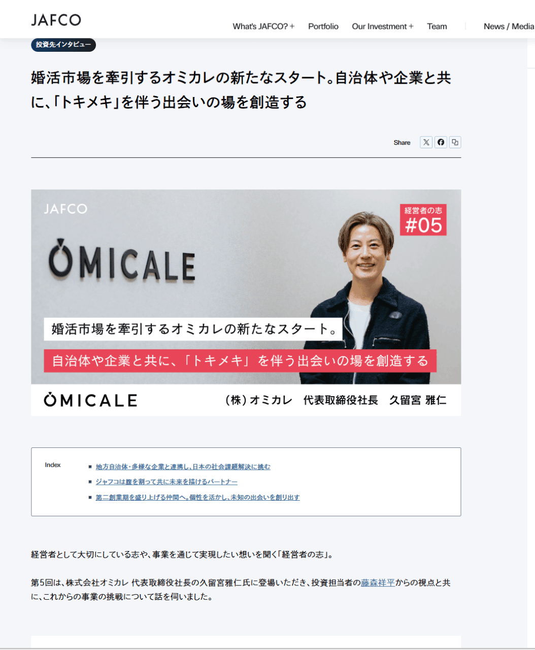 ジャフコ グループ株式会社コーポレートサイト内「&JAFCO POST」にて、株式会社オミカレ代表取締役社長・久留宮雅仁のインタビュー記事が掲載されました。